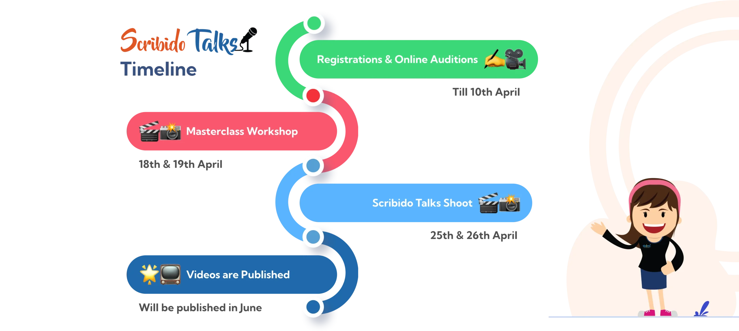 Scribido Talks is an online event, hosted on YouTube and scribidotalks.com. Students can choose a unique topic or subject close to their hearts and deliver a 3–5 minute talk. The process includes: